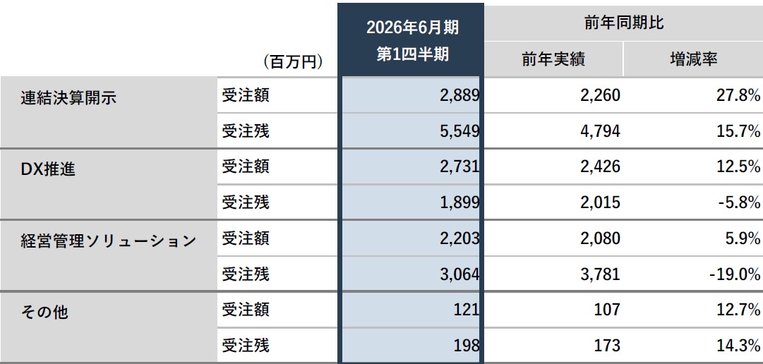 なお、当社は当第1四半期連結会計期間より、事業セグメントの区分方法を見直し、「連結決算開示事業」「デジタルトランスフォーメーション推進事業」「経営管理ソリューション事業」は1社1セグメントで構成し、その他の小規模法人については「その他」に区分するように変更しております。これに伴い、各セグメントの前年同期の実績値を変更後のセグメント区分に組み替えて表記しております。