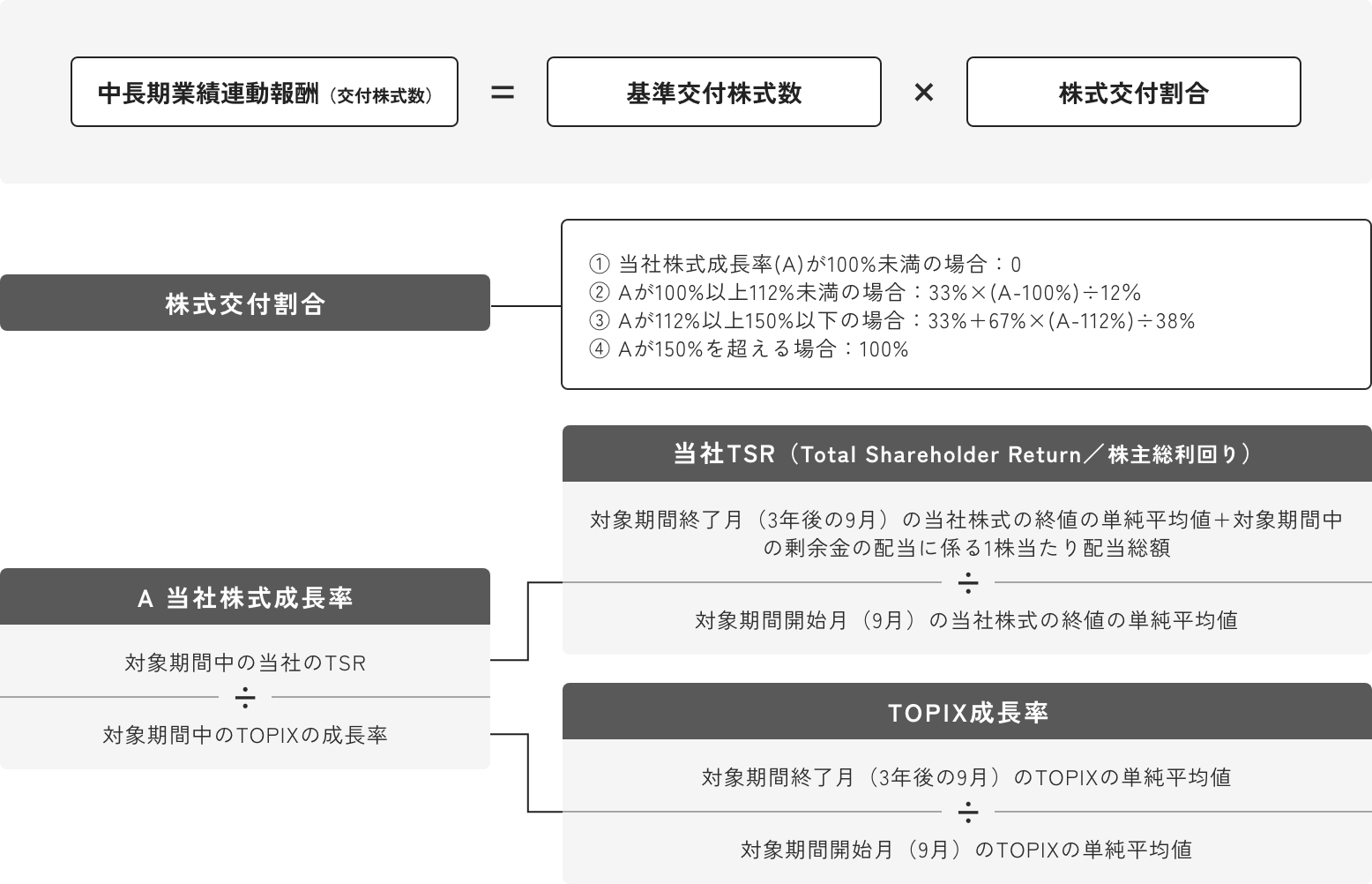 これは下記株式交付割合の③:Aが112%以上150%以下の場合にあたるため、基準交付株式数である14,507株の85%を交付しました。
